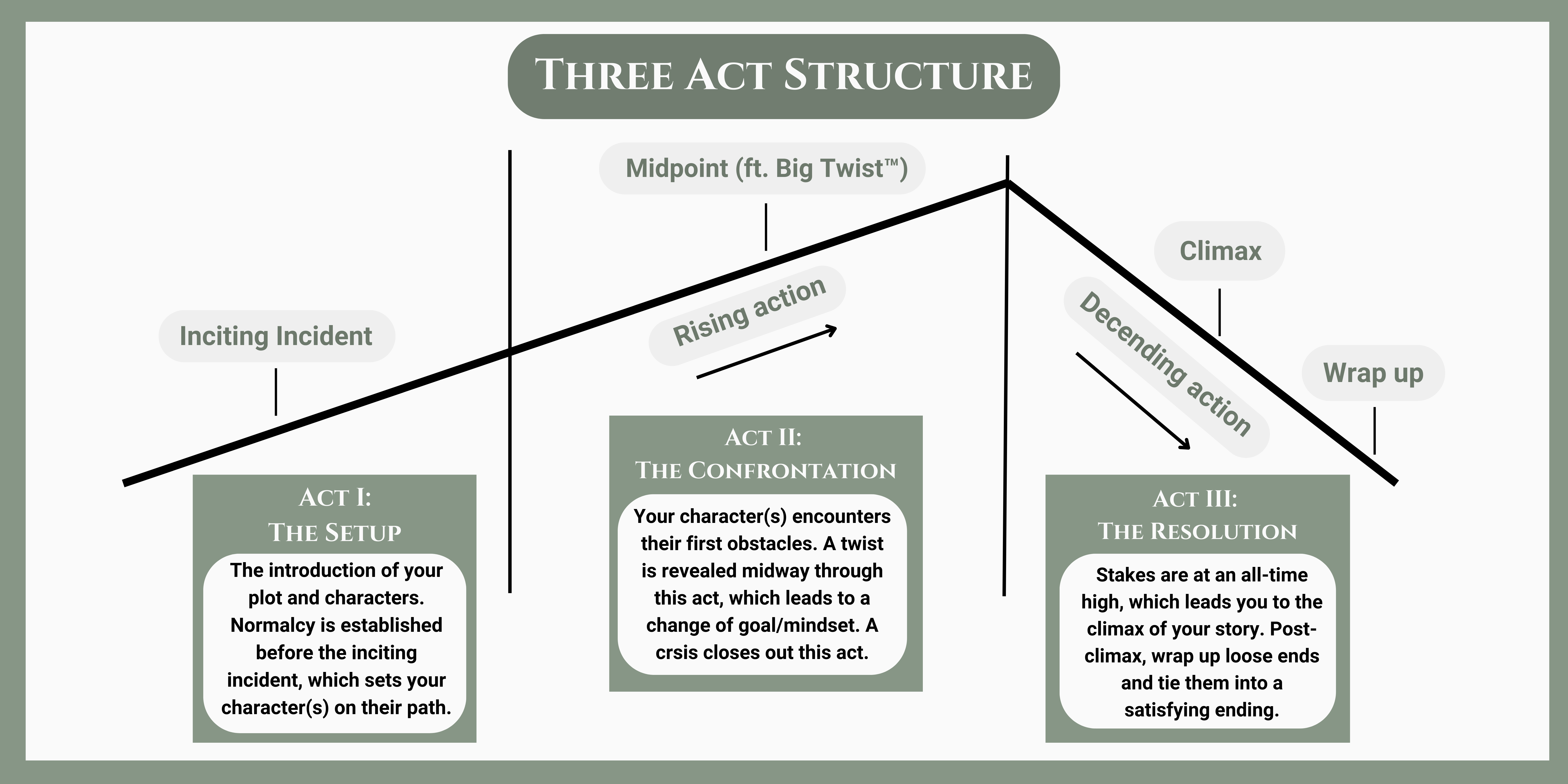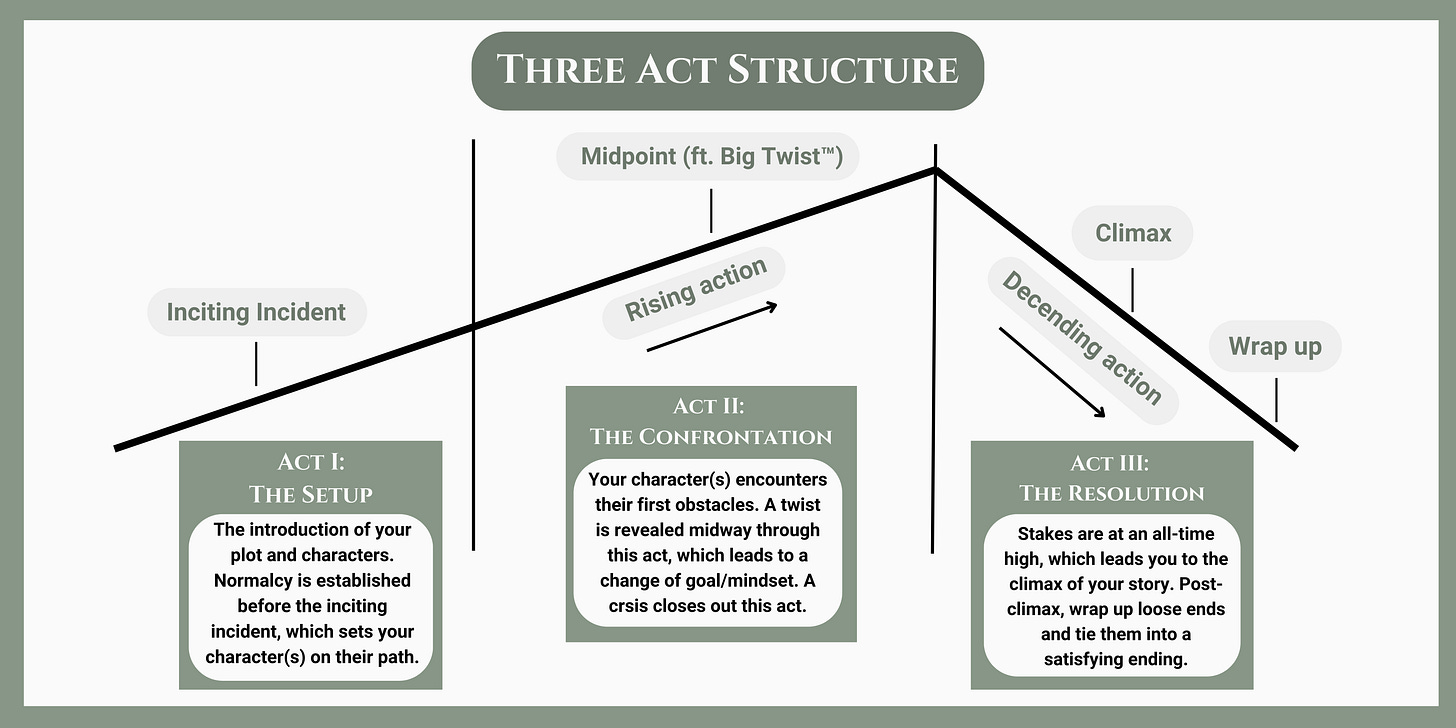 We’ll take a deep dive into the three act structure (and ways you can switch it up ;)) in a later post, but for now, we press on.